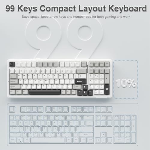 99-key streamlined layout,can save more space on the desk, and keep the arrow keys and numpad which are necessary for gaming and work.