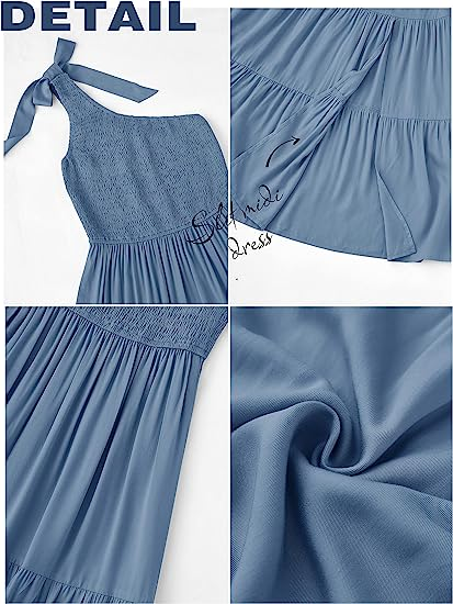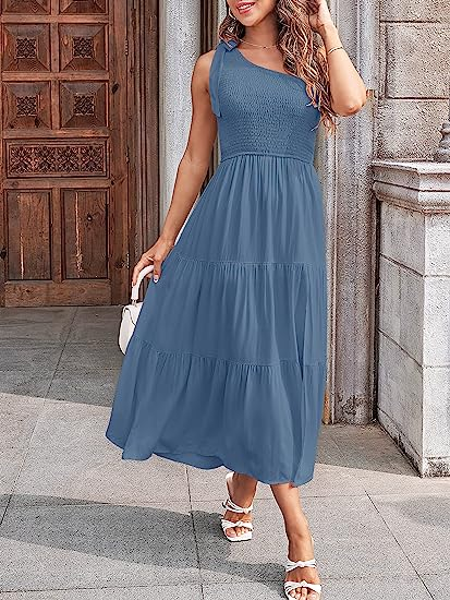 MEROKEETY Women's Summer One Shoulder Sleeveless Knot Smocked Midi Dress Split Tiered Flowy Dresses